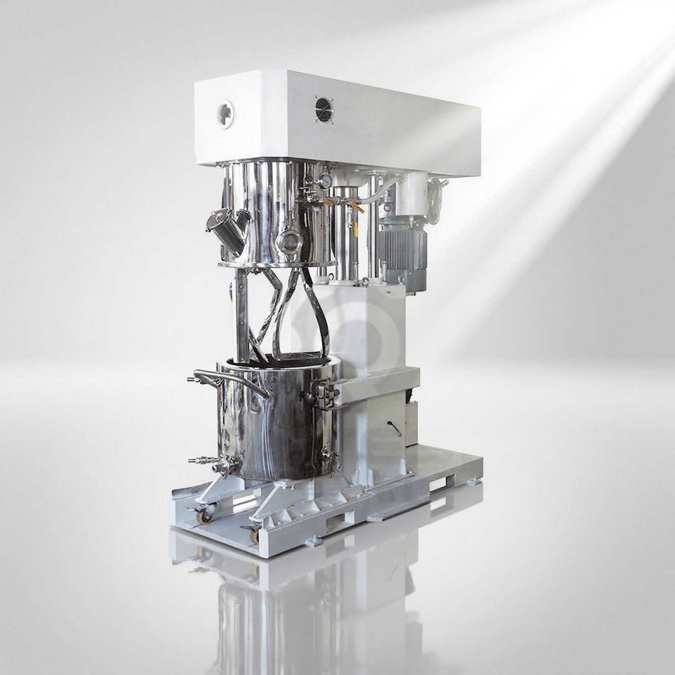 雙行星攪拌機(jī)雙行星混合機(jī)的攪拌槳葉,在公轉(zhuǎn)的同時也自轉(zhuǎn),使罐體內(nèi)物料上下及四周循環(huán)運(yùn)動,從而可在很短時間內(nèi)達(dá)到混合(混煉)效果。罐體內(nèi)壁為大型立車精加工,再經(jīng)大型拋光機(jī)自動 -